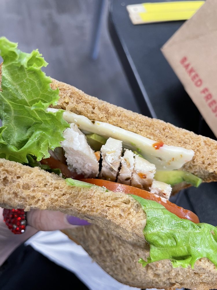 Chipotle seasoned chicken with tomatoes, lettuce, Pepper Jack cheese, and chipotle mayonnaise. Served with dill pickle, cookie and mint. Prepared on freshly baked bread as listed below, unless otherwise specified. Mustard, mayo and sandwich sauce on the side.