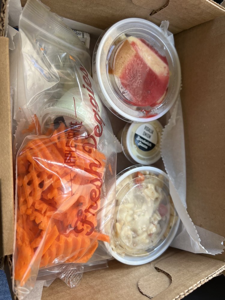Roasted red peppers, corn, black beans, tortilla strips, cheddar cheese, lettuce and avocado with barbecue ranch dressing. Served with dill pickle, cookie and mint.